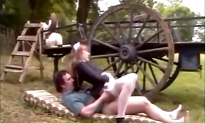 French maid in stockings plumbs on a farm with huge cumshot